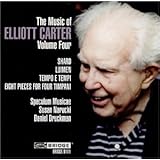 The Music of Elliott Carter, Volume Four ReviewThere is certainly no accounting for taste. Unlike the preceeding reviewer, the piece on this recording that really impressed me is "Eight Pieces For Four Tympani." All the other pieces are quite good as well, but the tympani piece is superb. Daniel Druckman is indeed a tympani vituoso. However, the typani piece is not simply virtuosity for the sake of virtuosity. There is genuine creativity and musical entertainment going on here, both in composition and interpretation. It's fun, fascinating and completely satisfying from beginning to end. Is the tympani piece worth the price of admission? I absolutely think so. Five stars for the tympani piece and 4 1/2 for the others.The Music of Elliott Carter, Volume Four OverviewWith this release Bridge continues its award winning series devoted to the music of Elliot Carter.This volume contain the premiere recordings of two recent Carter scores- the highly inventive Luimen and the stunning song style on Italian poetry, Tempo e Tempi.Performing on this CD are members of Speculum Musicae- the ensemble that has been most closely associated with Carter's music during the past 30 years.The disc opens with Shard, performed by the work's dedicatee, guitarist David Starobin.Shard is the second solo guitar work Carter has composed for Starobin, and is a brief, but highly volatile opener.Shard in its entirety was incorporated into Carter's next work- the shimmering Luimen.Speculum's performance of Luimen shows all the traits that have made Carter's recent music so intriguing- great rhythmic freedom and superb control of form in combination with high spirits and good humor.Tempo e Tempi is a set of eight songs based on poems by Eugenio Montale, Salvatore Quasimodo, and Giuseppe Ungaretti.Called by annotator Malcolm McDonald, "one of the most beautiful song-cycles of recent times," Susan Narucki's radiant performance captures these songs to perfection.Finishing this program is Eight Pieces for Four Timpani in its first complete performance on CD.It is performed by Speculum and New York Philharmonic percussion virtuoso Daniel Druckman, son of the late, great American composer Jacob Druckman.Want to learn more information about The Music of Elliott Carter, Volume Four?